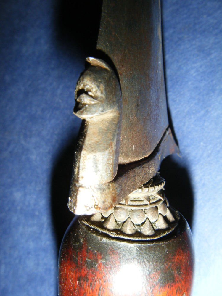 thank you very much for comment, food for thought. It's late here in Germany and I have to work tomorrow again so only short. You are correct, the mendak seems to be damaged, like you I am nearly sure about this. The wrongko is definitively old/antique and very well used over a long time while I agree that the pendok is fitted later to it but this with some understanding and I agree again that it was some time with this wrongko. I've bought this keris for the price of a two person meal by McDonalds only because I want to be able to handle this unusual piece. Here two pictures from the auction. Regards, Detlef |