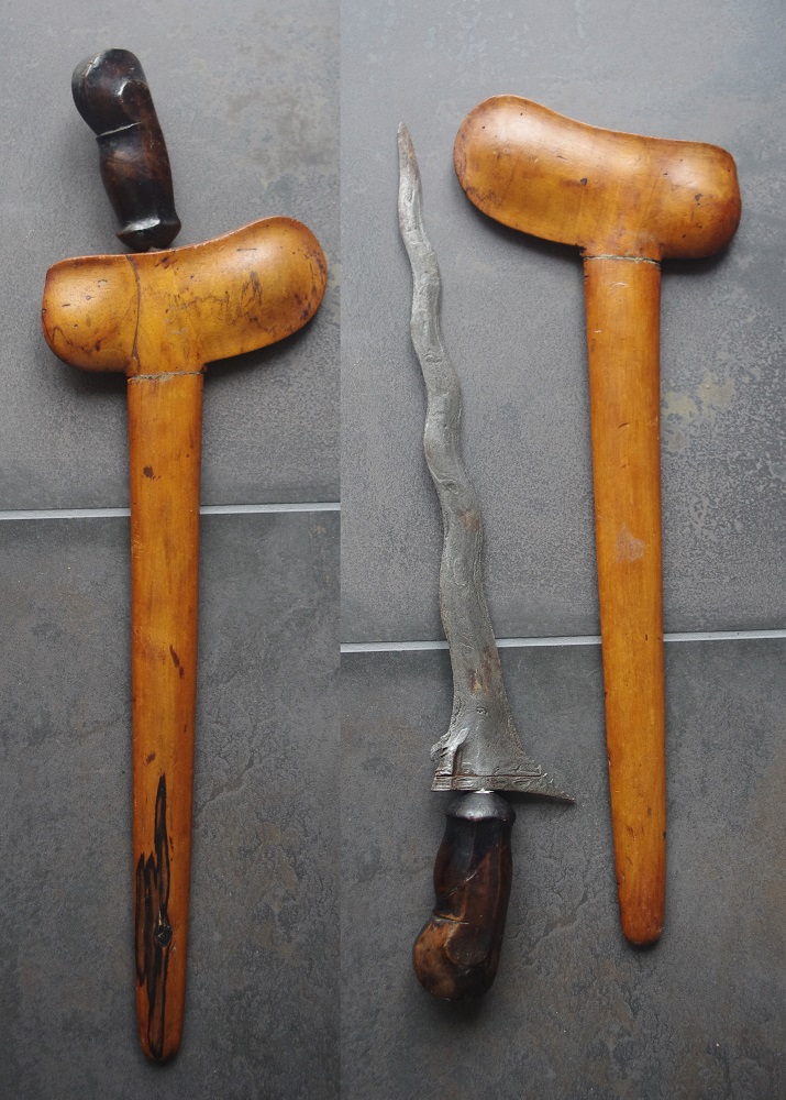 This keris has many javanese features (Sheath, blade surface, mendak), but also others are strange compared to my other javanese keris (the size: 40cm for the blade) and the hilt representing Ganesha. The scabbard measures 47cm and fits well with the blade. The hilt was broken and repaired with a lot of glue in the past, impossible to remove. It looks like plaster (or resin?) painted to imitate old ivory. The hilt probably dates from the second half of the 20th century but the blade seems older. I think this Keris comes from East Java (or Madura?), but I don't understand the mix. What do you think?