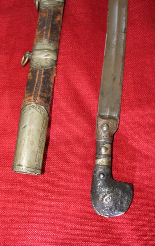 Another attic find at my in laws. Sad it's been subjected to the changes of temperature in an attic for 35 years. The leather on the scabbard is losing it's top grain when touched. I believe this is an Ottoman Sabre of some sort