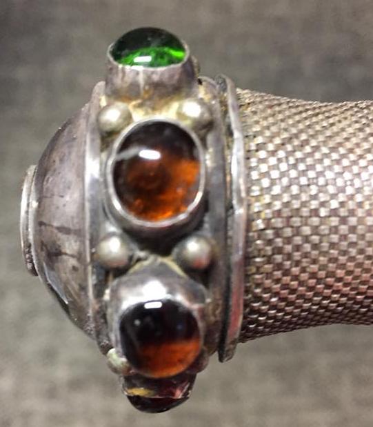 estimate 19th century silver woven with 8 glass gemstone able to ship worldwide, selling at USD330 before shipping. |