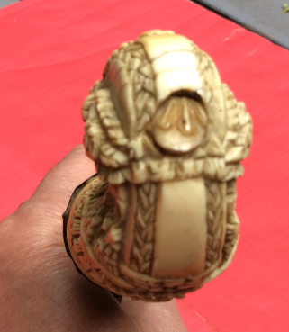 Silver sleeve over the scabbard with some old repair at the top. Handle is intricately carved bone, with a stable crack , but no obvious losses. All tight and stable. $350 Free shipment within continental US, overseas shipment at cost. |