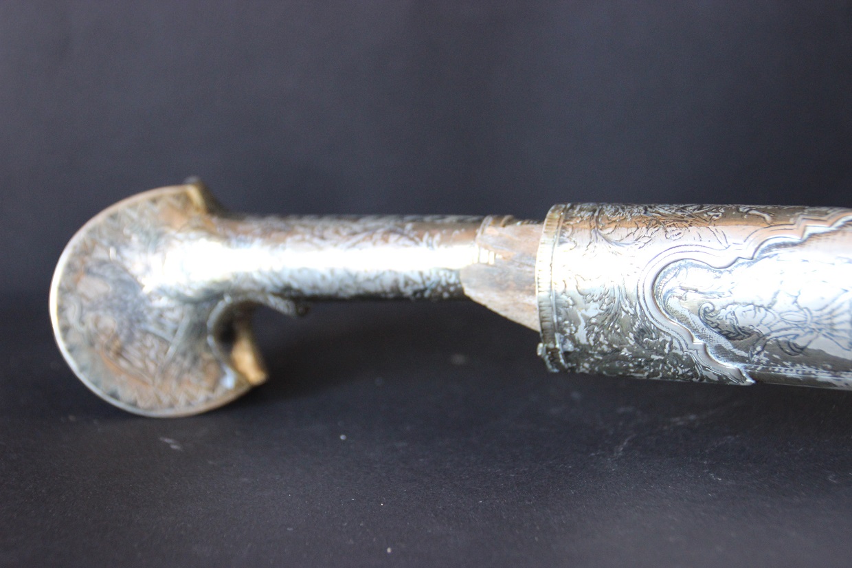 I wasn't sure to open this thread and then today I decided that it might be useful for collectors. According to what I read previously on this forum a Greek yataghan is a silver dressed yataghan with niello work... This statment is mainly a copy and paste of assumptions from dealers and it is not supported by litterature. This idea behind is mainly supported by the fact that niello work should be connected to Orthodox Christians (from Greece to Russia). Of course this idea is a nonsense, first because Muslims, Christians and non-Muslim were doing niello work such as the Jews in Morocco or Yemen. Second because this niello art work found his origins in the Byzantine empire and of course the Ottoman (Turkish) unherited of this technique and the skilled craftmen in the empire. 1/ As I explained previously using Elgood. There is no Greek yataghan as such. In his chapter on yataghans - and in fact in his whole book - Elgood shows very clearly that Greek arms and armour were Ottoman arms made in the Balkans, mainly Montenegro, Albania and Bosnia... plus of course Turkey. Greeks used Ottoman weapons. It's the reason why in his chapter on Greek yataghan Elgood shows many kind of yataghans from the classic walrus ivory ones to the silver dressed. Choosing only one silver dressed yataghan pictured by Elgood is not accurate to demonstrate something. The forum members can have a look at this chapter to see the variety of yataghans depicted. 2/ Nevertheless sometimes you can find some proper Greek yataghans as the ones pictured in this thread. For me a Greek yataghan is a yataghan produced for a Greek customer (sometimes done by Greek craftmen but not always). You can see here that the niello work is different from the Turkish niello work as such as the iconography: with characters, churches... Kubur Last edited by Kubur; 29th July 2019 at 03:55 PM. |