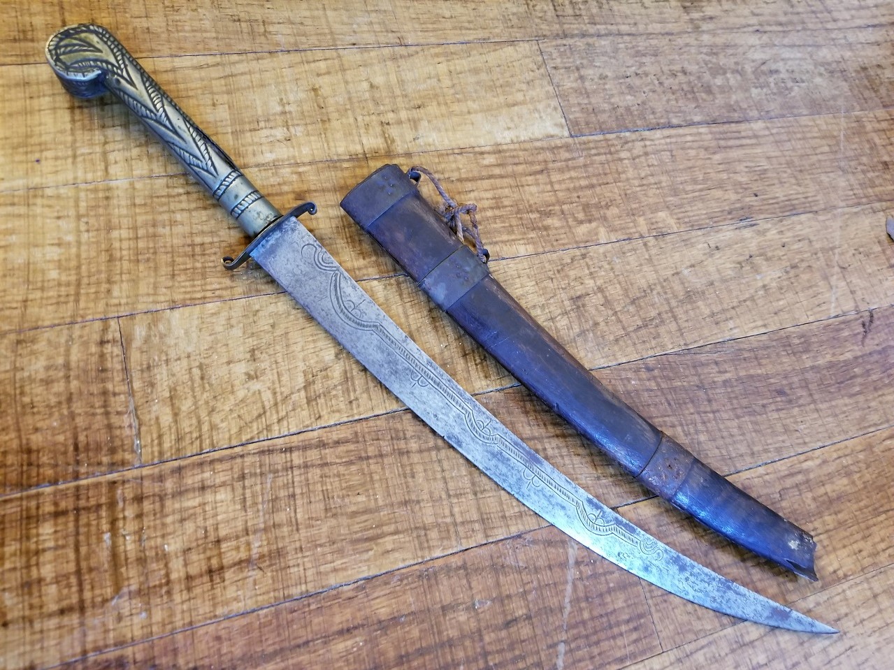 This Sinhalese Kastane sold at auction recently for a good price. It is not very old, late 19th or early 20th century. The interesting characteristic is that the blade is not the common local forged style with inlaid brass nor is it the older Dutch VOC imports often seen on early models. Rather the blade is a Berber North African flyssa style with geometric design and brass inlays. This type of blade was often seen on the "wedding" style nimchas or small ottoman influenced hilts with flyssa wooden sheaths sold at souks in Algiers in the early 20th century. This seems to be a strange marriage between sword and blade for the kastane. Possibly remounted at a later date?