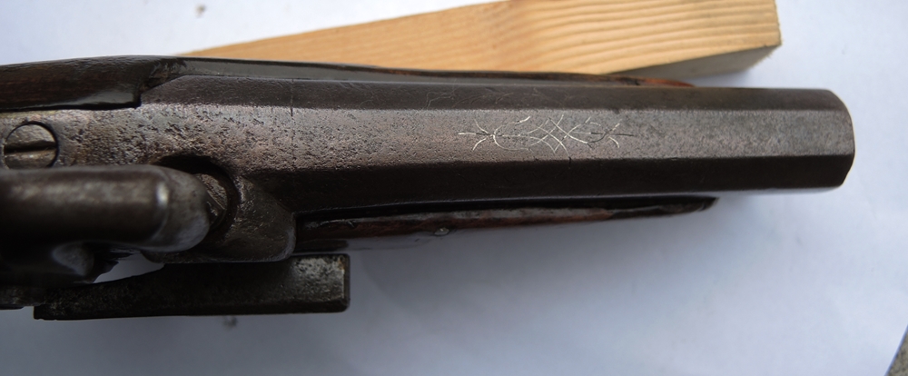 A couple of comments regarding your posts. 1. I agree that this lock is not a conversion, it was made as perc. If it was converted from flint, I would expect to see two plugged mortises below where the pan used to be. One was for the tenon of the vanished frizzen-spring. The other (which could be a simple hole rather than a squared mortise) would be to hold the stabilizing peg on the priming pan / frizzen bridle (the other point of support being of course the frizzen pivot screw, whose mounting hole has disappeared when the lockplate was cut out to fit the contour of the percussion bolster). 2. The iron backstrap is not, strictly speaking, a "typical Spanish feature" although it is seen on a number of examples from the period. It was characteristic only of pistols made in the Pyrenees foothills region of Eibar, facing the Bay of Biscay. And it, along with the metal-shod "birdshead" pommel also seen, appears to be derived from French patterns of the late 18th-beginning 19th centuries. It is interesting to note that the barrel of this pistol has ornamentation on its top flat, the flourishes being also common on Eibar guns. Eibar became pre-eminent as the gunmaking center of Spain in the 19th cent., after Madrid had become focused on luxe products for the Royal Court before the demise of the system of commissioned palace artisans , and after the once-prolific gun industry of Ripoll was devastated by repeated French incursions at the turn of the 19th century, and its total destruction in 1839. Eibar guns became known for technical refinement (gold-lined touchholes and pans, along with anti-friction rollers on locks) and visual elegance (such as Frenchified touches like birds head stocks). These elements graced firearms of otherwise quintessential Spanish design --an aesthetic that Madrid gunmakers probably sneered at as "provincial", yet notable for superb build quality and an honest, un-showy presentation. And thankfully, the tradition lives on today. Eibar is the seat of Spain's sporting arms industry, and some very fine double-barrelled skeet and field shotguns are still being built there. |