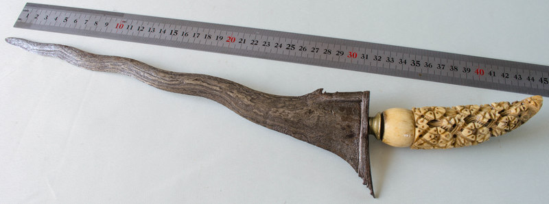Handle: ivory maybe (there is damage on one side) The scabbard is missing. Can the Indonesian weapons experts venture a guess on age and area of origin? |