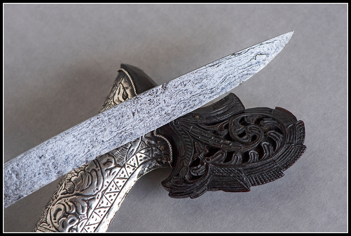 As usual, the crosspiece/mouthpiece of the scabbard is from horn and well-carved in fine detail. Either this got removed from SE Asia rather early or it might be somewhat later IMHO. The scabbard stem will be wood; if any of the silver covers could be slided off, some more info might be gained.