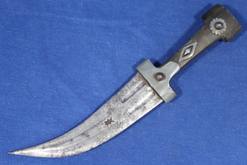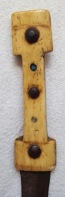 total length: 39 cm with scabbard - 32 cm without length blade: 18,2 cm length bone handle: 13, 5 cm - 2 cm small part and 3,5 cm wider part lenght scabbard : 25 cm ( wood covered by black leather) 3 rivest and 2 coloured small circular ornaments (green and blue approx. 0,35 cm) and one smaller missing piece / stone approx. 0,2cm Last edited by gp; 23rd May 2020 at 09:31 PM. |