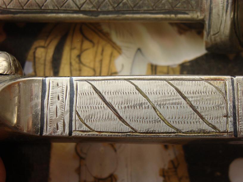 Another nice find, I think anyway. Ex Christies Australia, I think the hilt and scabbard are handworked silver with neilo to the front, a very strong double edged blade with a needle point that unforunately has light pitting at the tip. Any help with age etc would be greatly appreciated.
