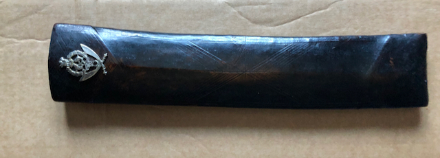First of all the measurements. Length in sheath - 43.7cm Length out of sheath - 42.3cm Length of sheath - 32.4cm Length of blade - 31.3cm Length of hilt - 11cm Sheath depth at throat - 7cm Sheath depth at base - 6.5cm Sheath width - 1.8cm Blade depth at tip - 4.7cm Blade depth at base - 3cm Width of spine at tip - 0.1cm Width of spine at base - 0.6cm Guard - 4.8cm x 4.5cm x 0.4cm Hilt - 8cm x 2.9cm x 2.5cm Hilt butt plate - 5cm x 3cm The scabbard and hilt structures match the look of many kukris I've seen. There's some corrosion at the base of the blade, presumably from contact with the sheath. The blade has a very clear lamination pattern. I assume the maker etched the blade as the ricasso is unetched on both sides. I have a couple of large Naga dao with exactly the same lamination pattern. The decoration on the blade is a form of punch dot in the form of flowers. The sheath has what seems to be a Ghurka military badge attached. I've often seen these on tourist kukris, but they're usually quite thick. This one is 1mm thick and rounded to fit the shape of the sheath. The hilt seems to have been plated and has worn. I can't tell whether it's brass that's been plated, or steel that's been gilded? Not really my field of expertise. The blade is sharp and well balanced, and obviously designed for practical use. I've never seen these two cultures combined in one weapon before, and hoped perhaps some of the more experienced collectors on this forum might have knowledge to add. |