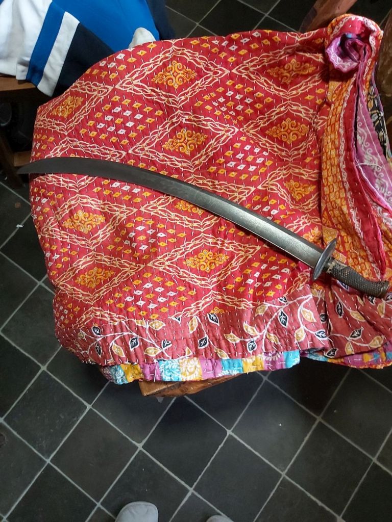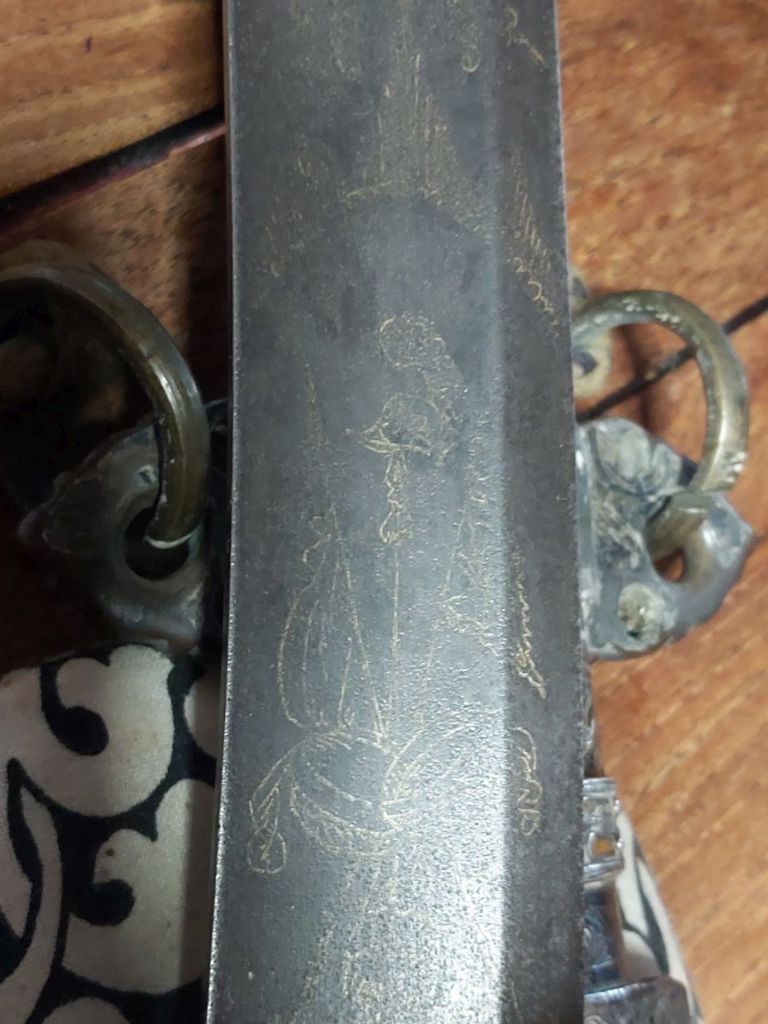Had a good look thru my British Naval Swords ref. book. Nada. It's marked on the ricasso G G on one side and a single G on the other, traces of bluing and gilt inlayed engravings on the blade as i'd expect in 18c & earlier examples. Brass shell guard broken, missing knuckle bow, Chequered wood grip looks mostly OK. Blade much like a 1796 LC. 27-1/2 ins total, 22 ins blade. Apparently the grip is a bit small for my friend's hands... Any info or suggestions would be appreciated, Thanks. Last edited by kronckew; 20th July 2020 at 09:12 PM. |