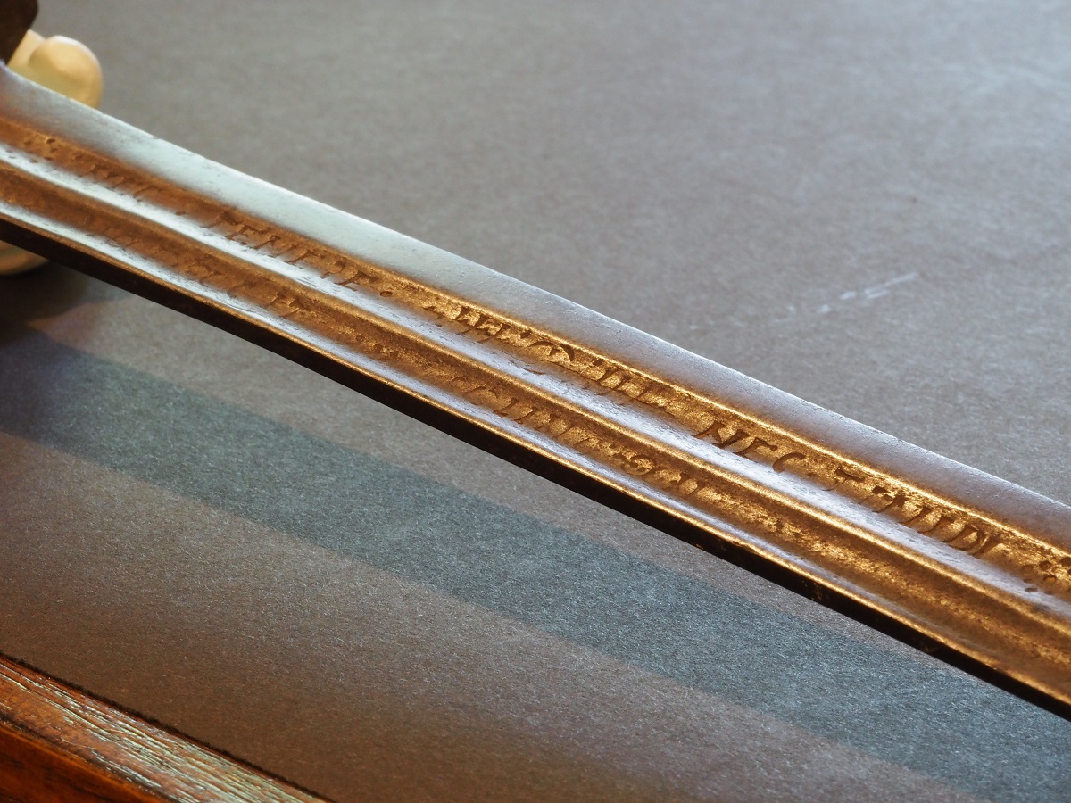 Thanks to your comments I've been googling "Backsword made in Solingen" and found this example with an almost identical double fuller blade. This one was made in the mid 16th century and re-hilted in it's current form in 1620-1640. It's a horseman's backsword with a 38 inch long blade! Mine likely looked very similar originally. (Pictures attached, I think it's ok to post pics and link since it's already been sold) Source: https://www.antique-swords.com/H21-1...Backsword.html Some quick research shows there appears to be little variation in-between the double fullers on backswords made in Solingen during the 16th-17th century's. Maybe the maker's mark on mine will help narrow it down to a more exact date but right now it looks like the earliest it could have been forged is during the mid-16th, latest is mid-late 17th century. Correct me if I'm wrong. |
