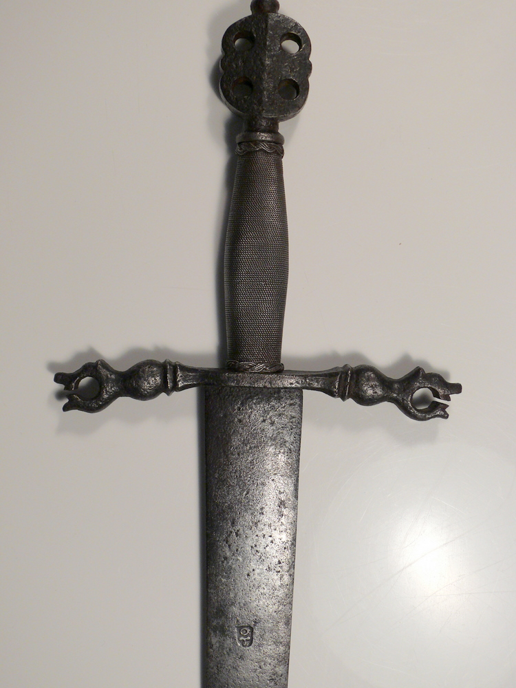 I regret not being able to offer the 'real thing' but hope that two similar, though heavily stylized, quillon finials on Landsknecht swords will provide a bit of additional backup information (the painting dated 1452, the sword ca. 1530).