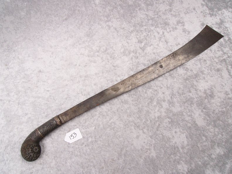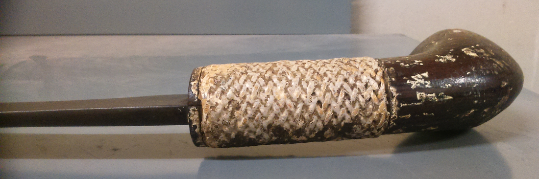 I recently found this heavy Klewang, sold as an African machete. I think it comes from North Sumatra, I have already seen it on the forum or on the internet with painted or engraved scabbard and foliage sculptures on the handle. Here the model is really very simple, just a weaving of rattan on a wooden handle. There are remains of an old white varnish covered in places with another brown, I think these are later additions made once the weapon arrived in Europe. The blade is thick and heavy, the total length is 77cm. Seems like a rare model, but I don't know what culture / people made this type of Klewang. Is there a more precise name than "Klewang"? Thank you in advance for your comments.