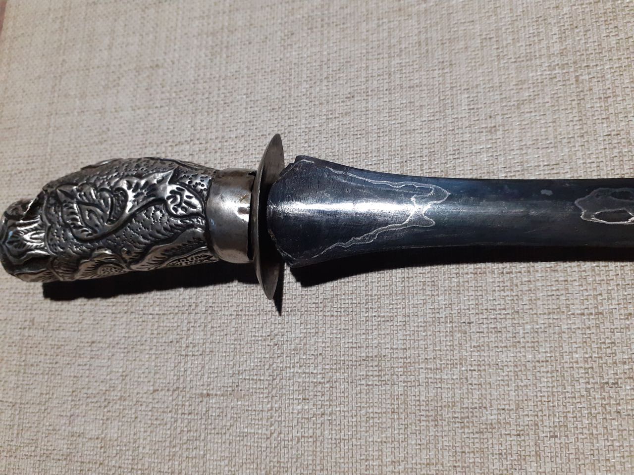 I'd like please your advice and opinion about this dagger, It looks like a pedang lurus but here it's more a small dagger ( 15 inches long with scabbard ) The hilt seems made of better quality ( and older ?)than the scabbard, I find the ornaments on the scabbard made in a '' mechanical'' way, not silver I think, seems too stiff The blade is interesting : large and thick, lamination on the blade reminds me some kriss blades so I wanted to show it to you... |