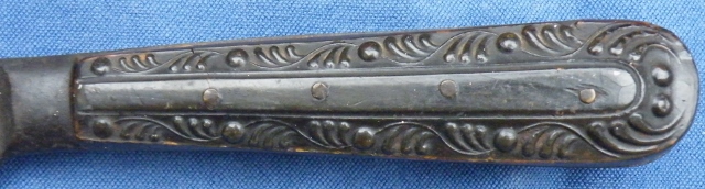 Regarding dating, as the hilt scales are made of gutta-percha, this precludes a date of manufacture prior to the mid 19th century. I should also mention that looking closely at the blade, there seems a fair chance that the profile has been rounded off to form a spatulate end, rather than coming to a point, at some later period ? I have had a good look over the internet to find a similar knife, but without success, although the impressed design to the gutta-percha is quite typical for the Victorian period. Can anyone find an image of a comparable piece ? Any more information is of course welcome. |