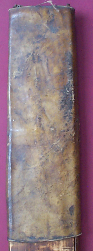 Hopefully someone can Id this sword. I'm stumped. The T-rib blade measures 19" (48.26cm) and the hilt is 4.5" (11.43cm). At the hilt the spine measures 9/32" (7.5mm). The blade edge is distinctly rebated from the sides of the blade but the edge thickens up next to the hilt. Near the tip there are three notches on the spine. The regularity of size and spacing indicate deliberate placement by the smith or owner. Save for these notches, the blade is unadorned but shows evidence of folding. The hilt is wood with a brass ferrule and a brass band below the pommel. Both the ferrule and the band have punched decorations that differ on either side of the blade. The carving on the hilt appears to be an imitation of a braided and wound fiber hilt wrapping. The wooden cheeks of the sheath appear to have been held apart by a steam bent piece of rattan? (bamboo?, wood?) that has now broken at the tip. An 8" (20.32cm) wide piece of rawhide forms the sheath throat. The rawhide has been laced together on the back of the sheath with vegetable fiber thread that appears to have been tarred. I suspect the the lower part of the sheath was held together with some sort of wrapping also. Given the blade and hilt shapes plus the notches on the blade, my guess is a south east Asian dha relative but the blade is much lighter in weight than any dha I've seen and the T-rib isnt typical for dha either. The hilt sort of looks like a Thai dha but it's much shorter. So, as I said at the beginning, I'm stumped.