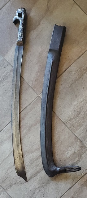 The native SHOTEL (DE curved), with what seems a native blade with typical raised midrif and likely 1870s+ and rhino hilt. These were used well through 1930s,