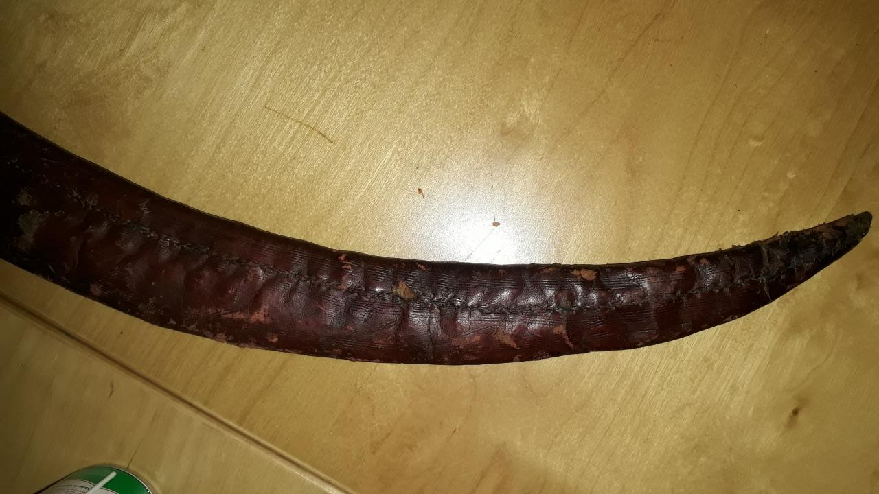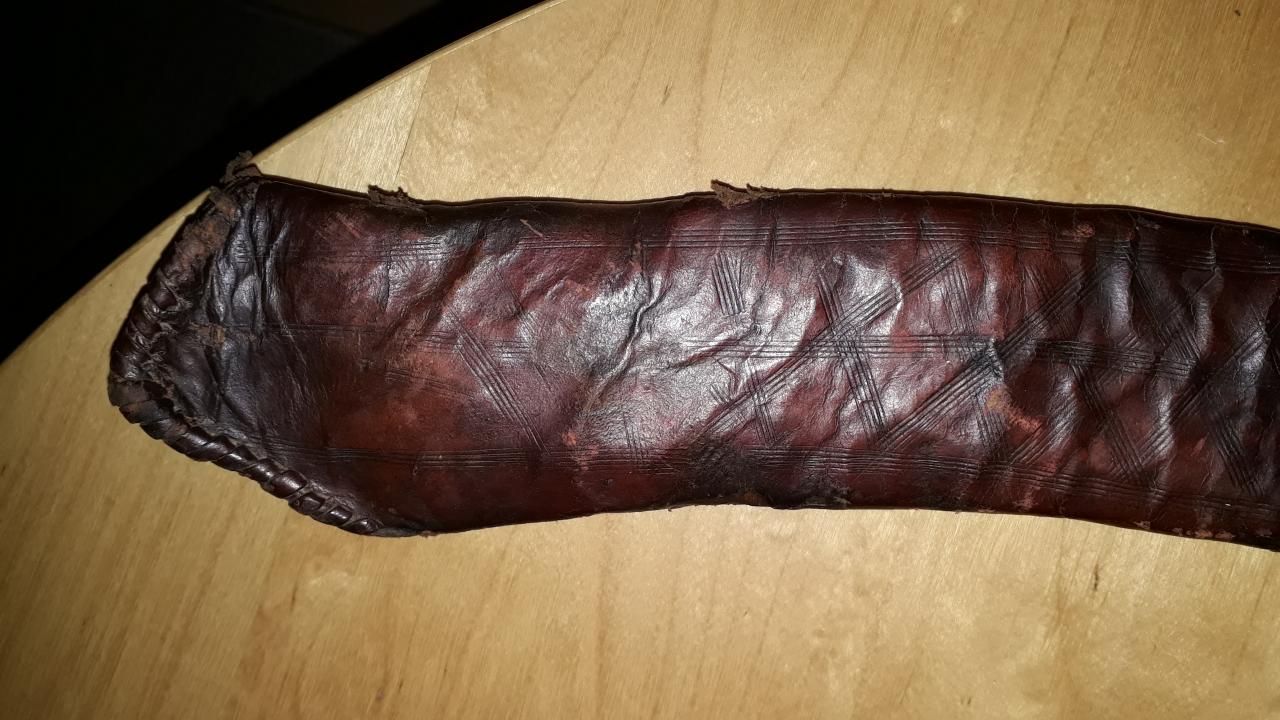 One more thing about the ethanol maceration: I wouldn't do that with a shotel sheath. This sheath probably consists of two layers. The rawhide scabbard is covered with a fine leather with an embossed pattern, and that could get ruined.