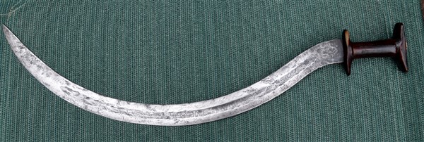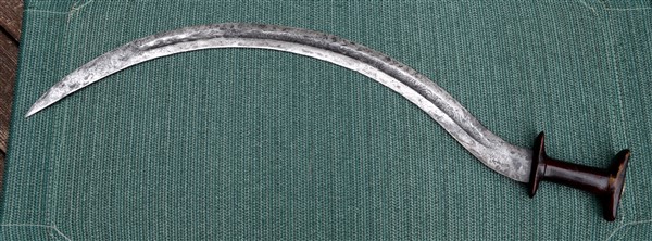 Holding this sword, which was strangely well balanced for such an awkward looking weapon, had the feeling that it would be murderous in close combat. Another note of curiosity was the handle; when I first got it I thought it to be made of wood, but seeing the area where there is a broken piece, makes me think it could be some type of horn. |
