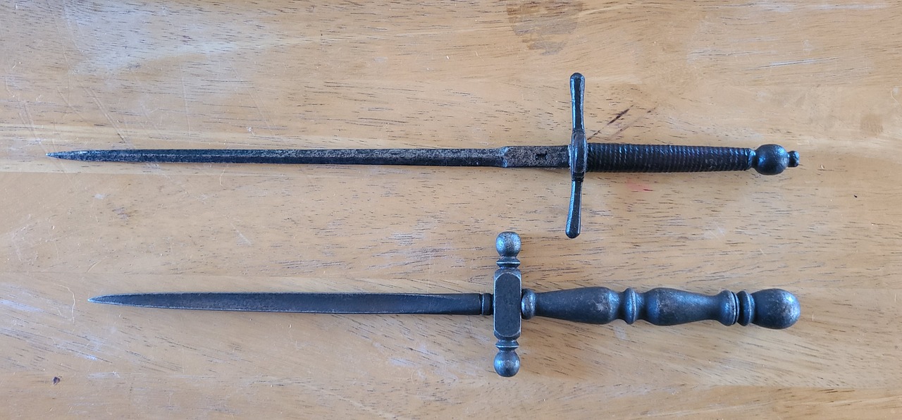 I recently received the pictured stiletto in an auction lot of assorted daggers and I'm hoping someone can help me identify it. It came with a tag that said "Gunner's Dagger $1,650" - which would be an absurd price even if it was what it claimed to be. In the picture, it's next to an early 17th century northern Italian stylet and screams modern to me, though I'd love to be wrong. It is very similar to the All-Steel Stiletto sold by Windlass Steelcraft, but smaller, with slight differences in the handle. Under magnification, there was a faint mark almost completely obscured by patina. Sacrilege though it may be, I had to know and uncovered it. I've been trying to figure out what it's supposed to be - my best guess is some sort of crown? Any chance anyone recognizes the mark? Ultimately, I guess I'm trying to determine if it's an old reproduction or a new one. Overall length: 13.0625 Blade length: 7.5625 Thanks! |