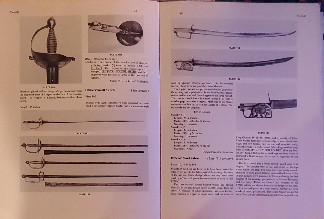 As we have discussed, it seems that the Spanish rapier blades of the 16th century remained in favor for virtually generations after the demise of Toledo in the mid 17th century. By about the 1630s, the innovative machine of Solingen was producing blades spuriously marked with markings and names of famed earlier makers of Toledo. These were mostly broadsword blades and others, but included the thin thrusting blades common to the Spanish rapier. The Spanish swordsman was known for the mysterious, geometrical and occult oriented system of fence known as DESTREZA, commonly referred to in fencing references as 'the Spanish fight'. By the end of the 17th century, the beloved cup hilt rapiers of Spain were giving way to a smaller, lighter and faster sword for fencing regarded primarily as a French innovation though it as well known across Europe. The 'French' style of fencing primarily based on the 'smallsword' became dominant through the 18th century. The Spaniards, in the Peninsula largely adopted the French manner and of course the swords, nominally. However, in the colonies in the Americas outside the direct influence of the Spanish courts in the Peninsula, the traditional elements of destreza remained very much in practice. The strong hold to Castilian tradition remained in place in the Americas well through the 18th century into the 19th, In the latter 17th century, the Solingen made blades for various types of swords were shipped in volume to the Americas and certainly well into the 18th, the double edged rapier blades were profoundly in these numbers. In recent years, the wreck of a Spanish nao was found off Panama with many crates of these raoier blades, and had gone down in 1681. These raoier blades had continually been exported into the Americas literally for generations, and were regarded as 'TOLEDO' blades (for the familiar markings) despite typically being of Solingen production. Attached photo of one of these blades. In the Americas, well into the 1800s, officers and those of high station used the now familiar small sword, however rather than the typical trefoil blade used in most European versions, Spaniards preferred the traditional TOLEDO blade. This is well noted in "Spanish Military Weapons in Colonial America 1700-1821 (Brinckerhoff & Chamberlain , 1972). where three of these swords, stated origin MEXICO clearly with small sword hilts and TOLEDO blades. These date end of 18th century. While these examples are from the colonies (i.e. Mexico) and likely mounted with blades long already in these regions, possibly either stored or long in circulation, they do in degree reflect the propensity for Spaniards preferring their traditional rapier blades. In my own experience, I must agree to not having seen examples of any Iberian smallswords or court swords which were mounted with the type blades (trefoil or colichemarde) characteristically on the European (or American ) versions. Obviously there will likely be exceptions, however I agree that 'typically' the earlier form of Spanish rapier blade prevailed on Spanish swords, as well it seems even on some English swords. |
