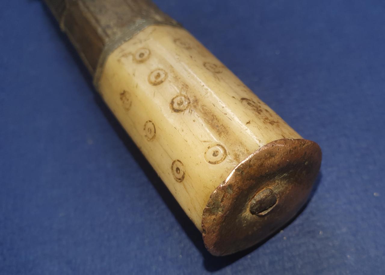 Offered is an old to antique knife, a possible guard seems to be missing, pitting to the blade with engravings, handle from green horn and bone, top plate at the handle is loose, a piece of the green horn is missing, still an interesting knife. 25, cm long, blade 15,2 cm, 88 gram.