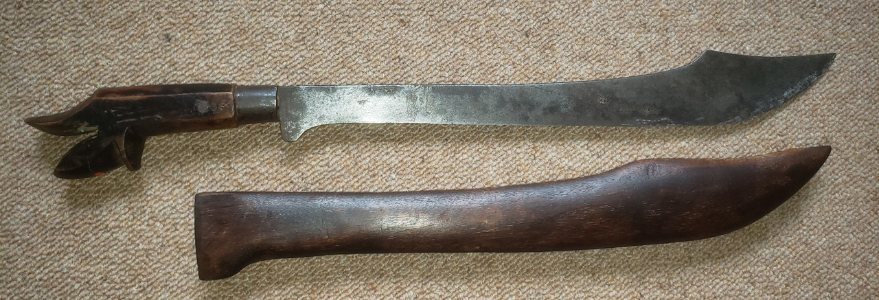 My latest acquisition arrived this morning. It was said to be a parang from Maluku. The blade (which could do with a clean) is 39 cm long. The handle is wood, with a small coral? inlay. the scabbard is hardwood (teak?) and is open along the length of the blade. Any comments/observations would be much appreciated.