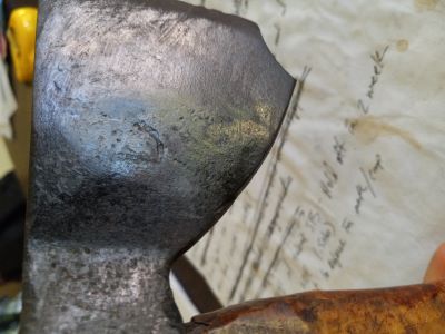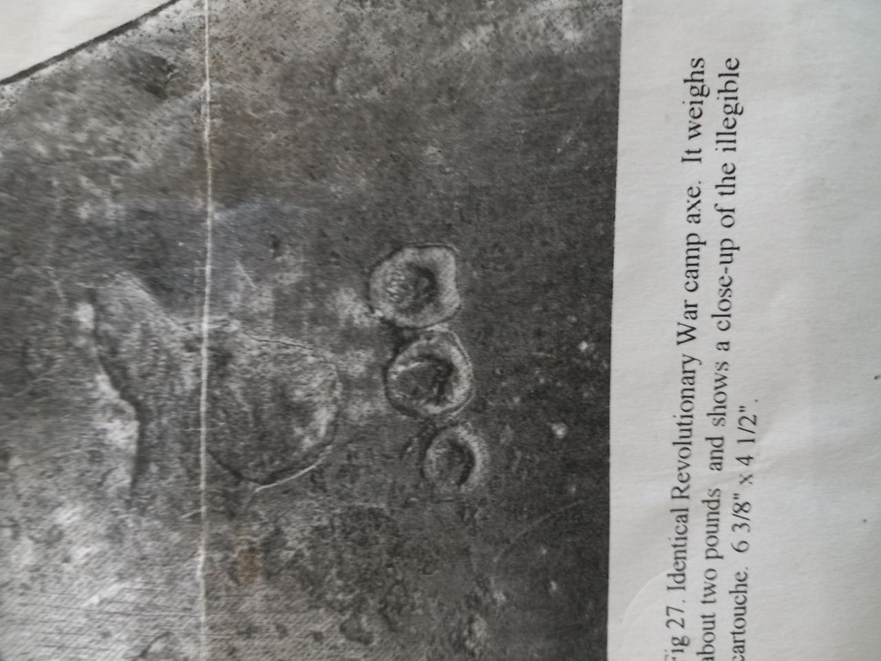 A "U" on one side and "CC" on other side with circle marks. I've attached a documented revolutionary war camp axe with similar circle marks.