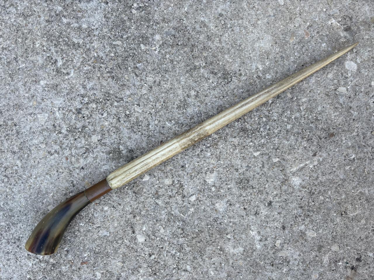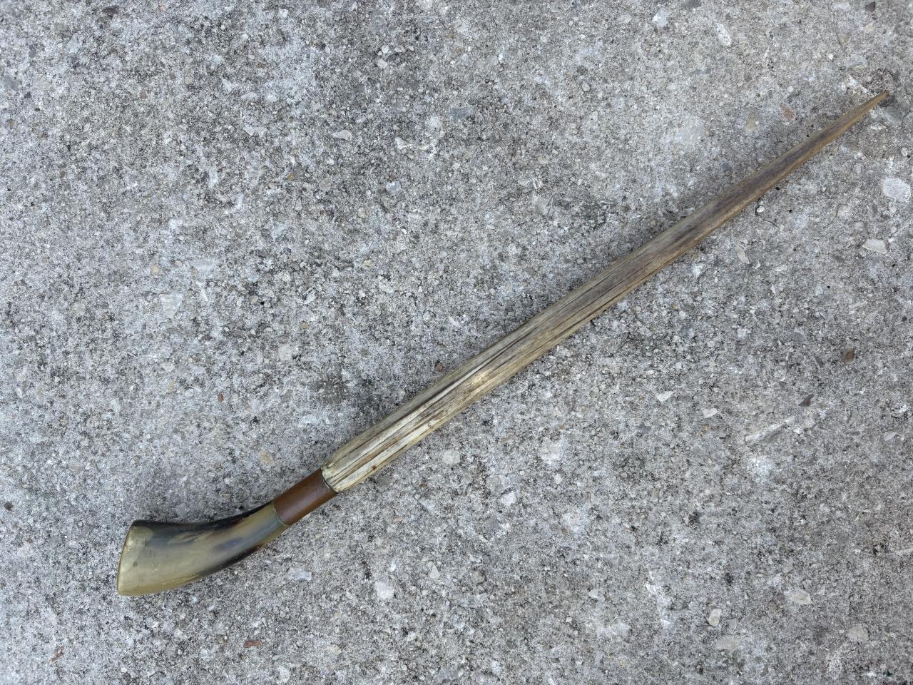 I’m curious to know where this dagger might be from. Doesn’t appear to be particularly old. I’m not sure if the “blade” is a billfish bill or perhaps mammalian leg bone? The hilt is the tip of a cow’s horn. The sleeve or ferrule is thin brass. It’s just held in by friction and is loose as you can see. Any input is appreciated - I know this may just be a curio or knickknack!