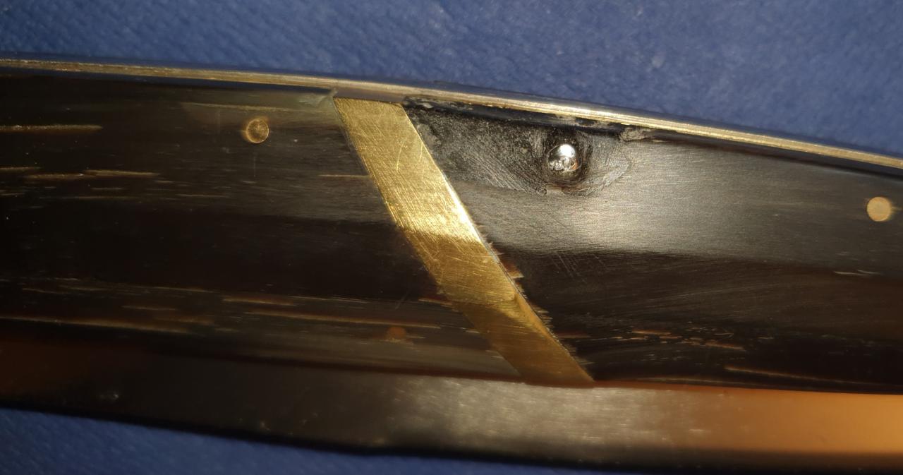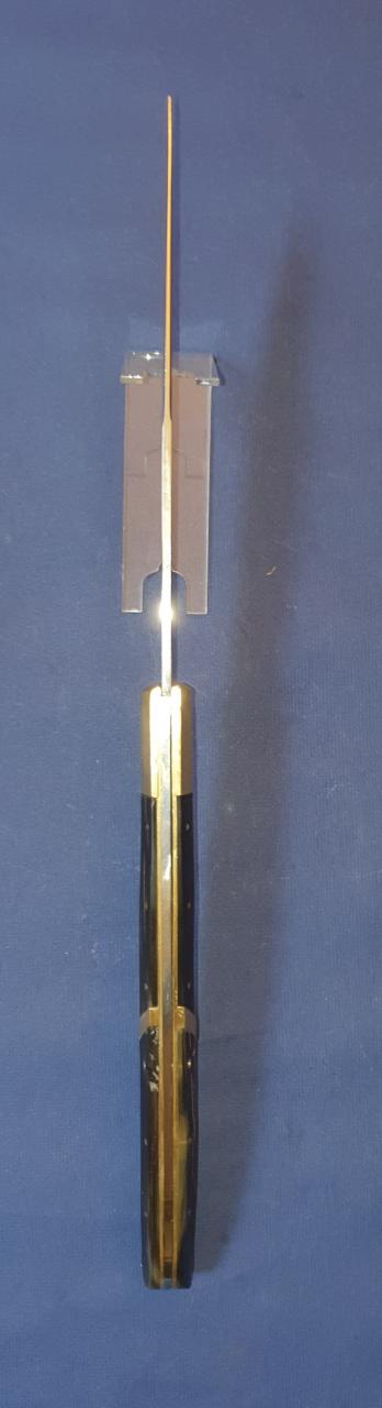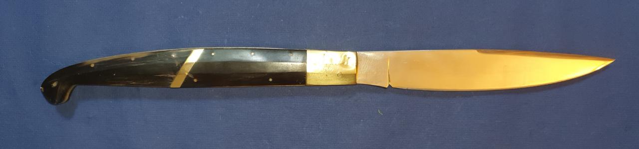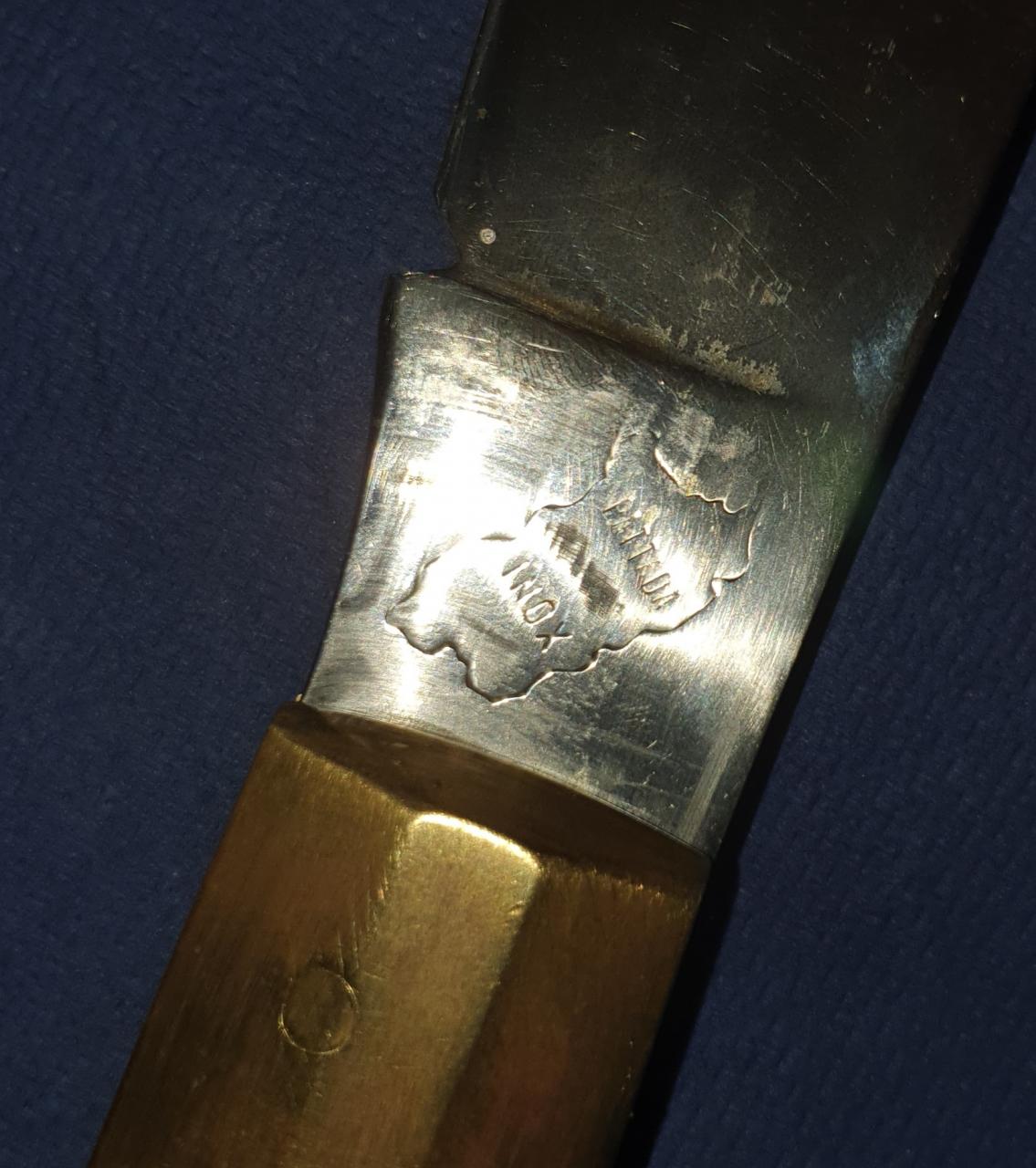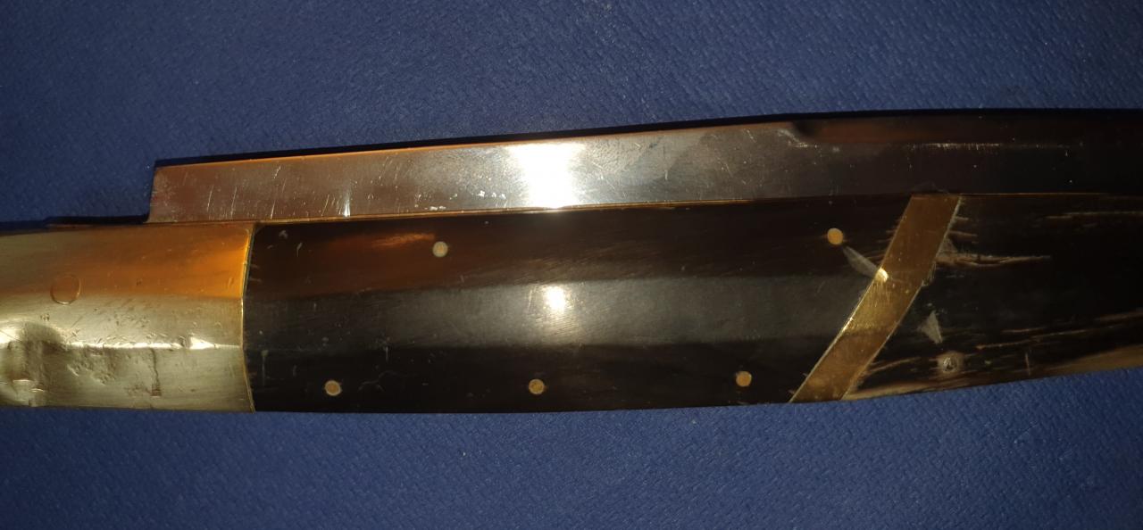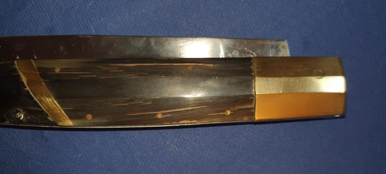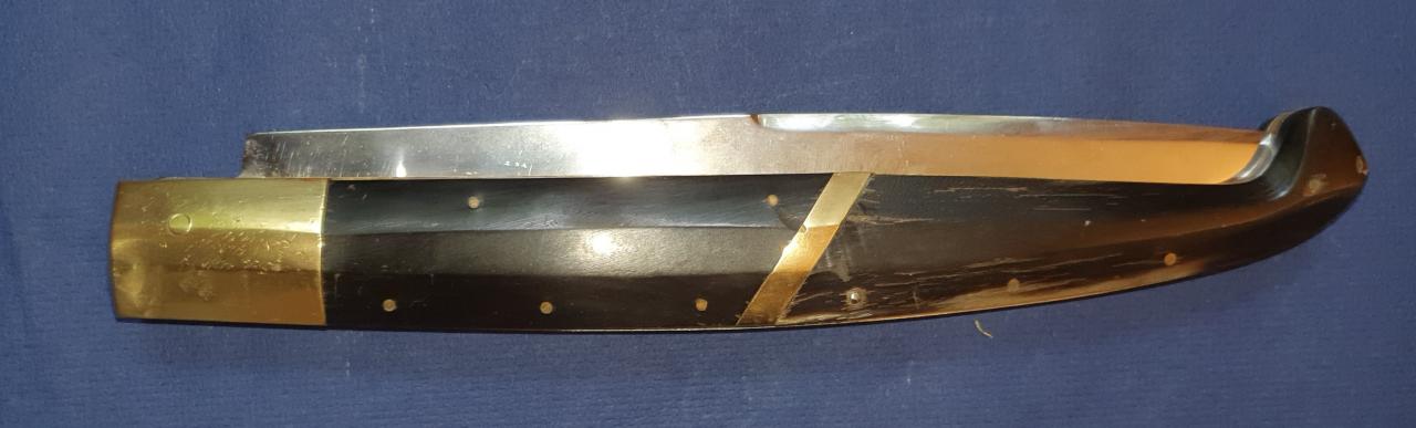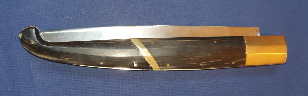 There are scratches and dents especially to one of the brass bolsters and seemingly a repair/restoration to one of the presumably muflon horn handle scales. The blade which is very sharp shows sharpening traces at the edge. There are also fine crevices at the horn scales. Over 50 cm opened, blade 23 cm, a little bit under 27 cm closed. 572 gram. Asking price is 250,- Euro plus shipping. Contact me by email: deuterdetlef@gmail.com |