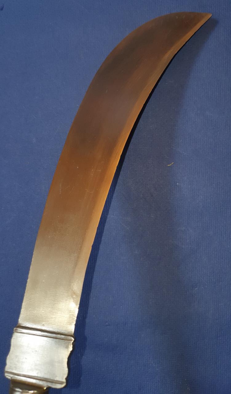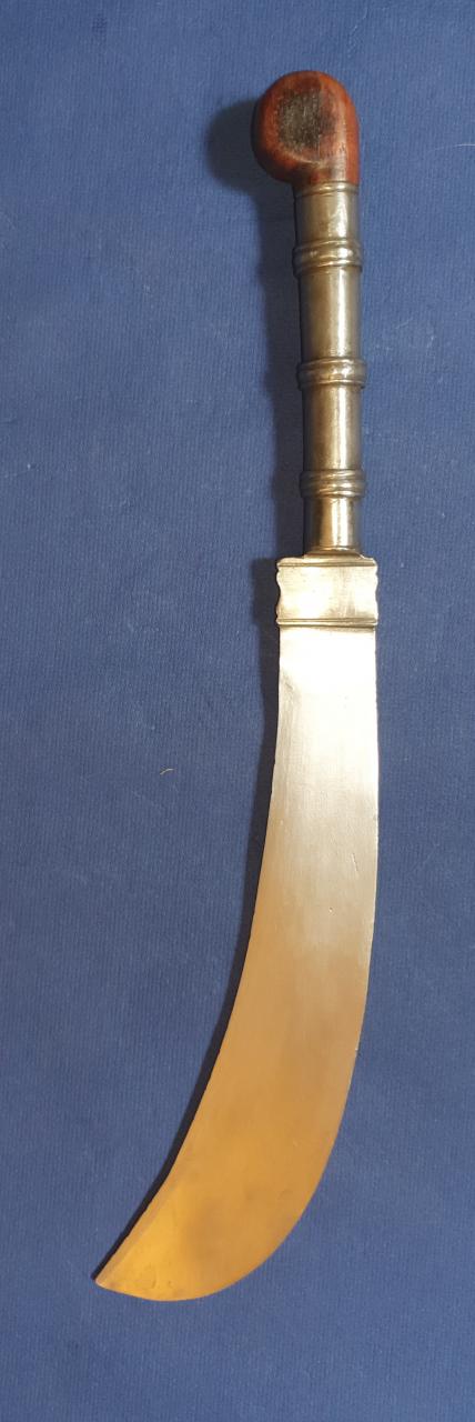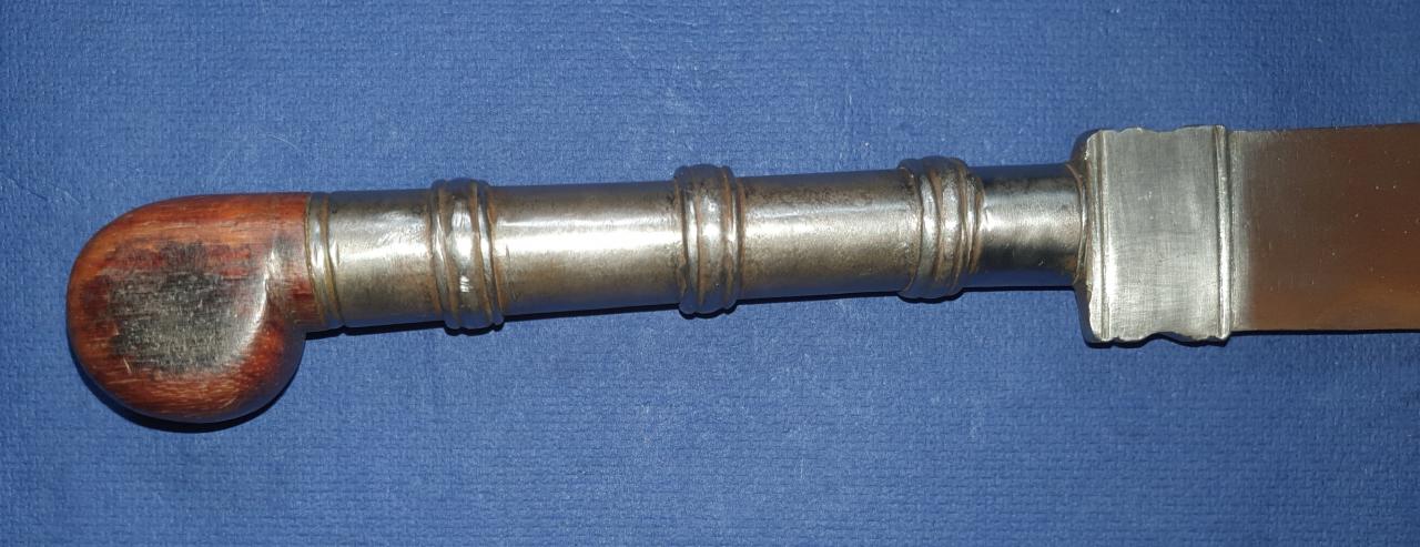I offer this katthi from the Moplah people from the Malabar region of India. A quite heavy and robust chopper made for use. A four part iron ferrule give strength to the handle, thick (7,5 mm) ricasso, one-sided beveled cutting edge. Nicks to the edge and some spine damage, see pics.