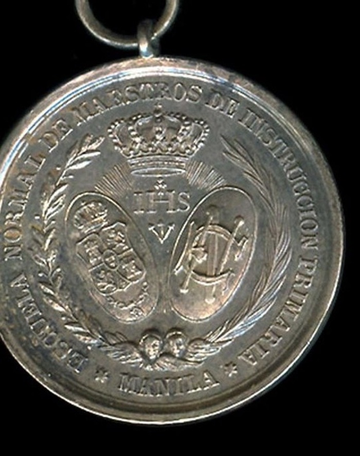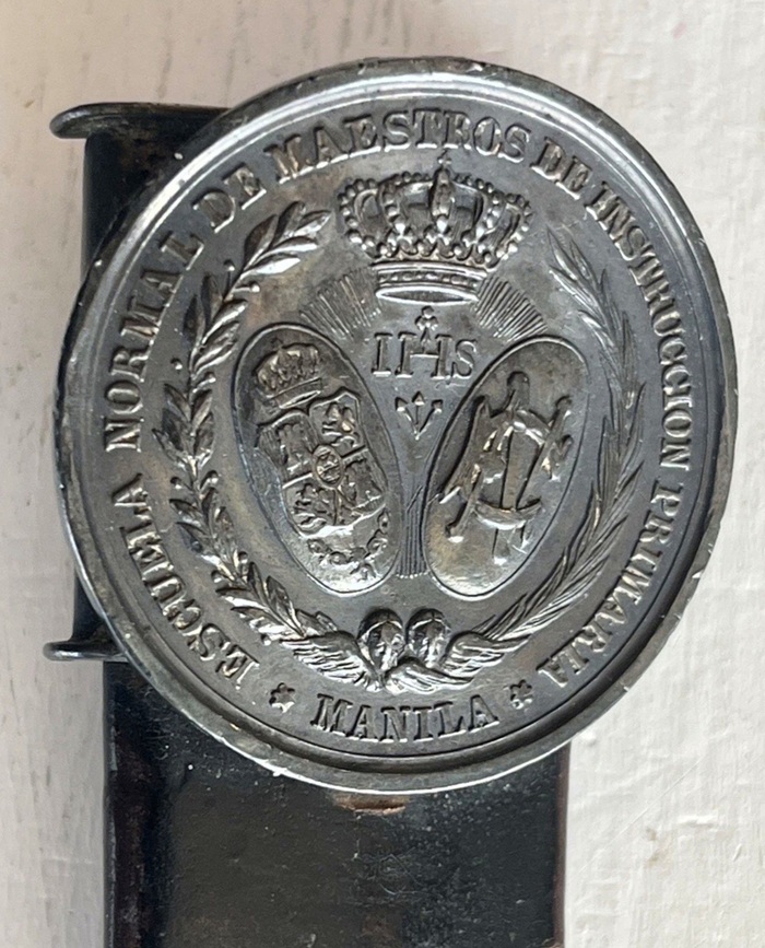 "If the knife came with a sheath it would provide a clue as to region of origin." The Spanish/Philippines example was the only piece that came with a sheath (silver mounted hide, partially damaged), but I didn't want to post it as I didn't want the latter(?) attached silver medal (as seen below) to distract from the overall evaluation of the dagger itself. Meaning................... I didn't want board members to focus their attention on the medal as opposed to the overall construction and craftsmanship of the dagger itself. I wasn't 100% sure if the dagger was/is Spanish/Philippines until I got confirmation from a group of experts such as yourselves. The medal appears to be a later(?) attachment or possible original(?) given as a gift of achievement or honor, not really sure. |