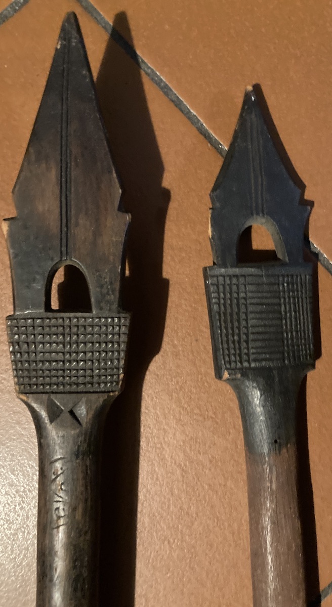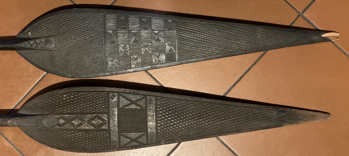 While driving to the store I saw a sign saying “Estate Sale” so I went in to have a look (because you never know, you know). I walked out with these two African paddles. I think they are 19th to early 20th century. Can anyone confirm this? Can anyone id geographic area and people? There is very recent damage to the tip of one which I would like to repair. Does anyone know what type of wood these paddles were made of? Sincerely, RobT |