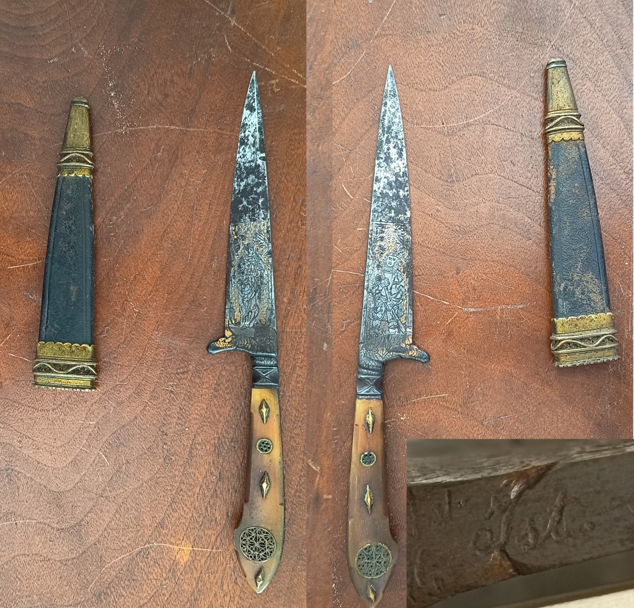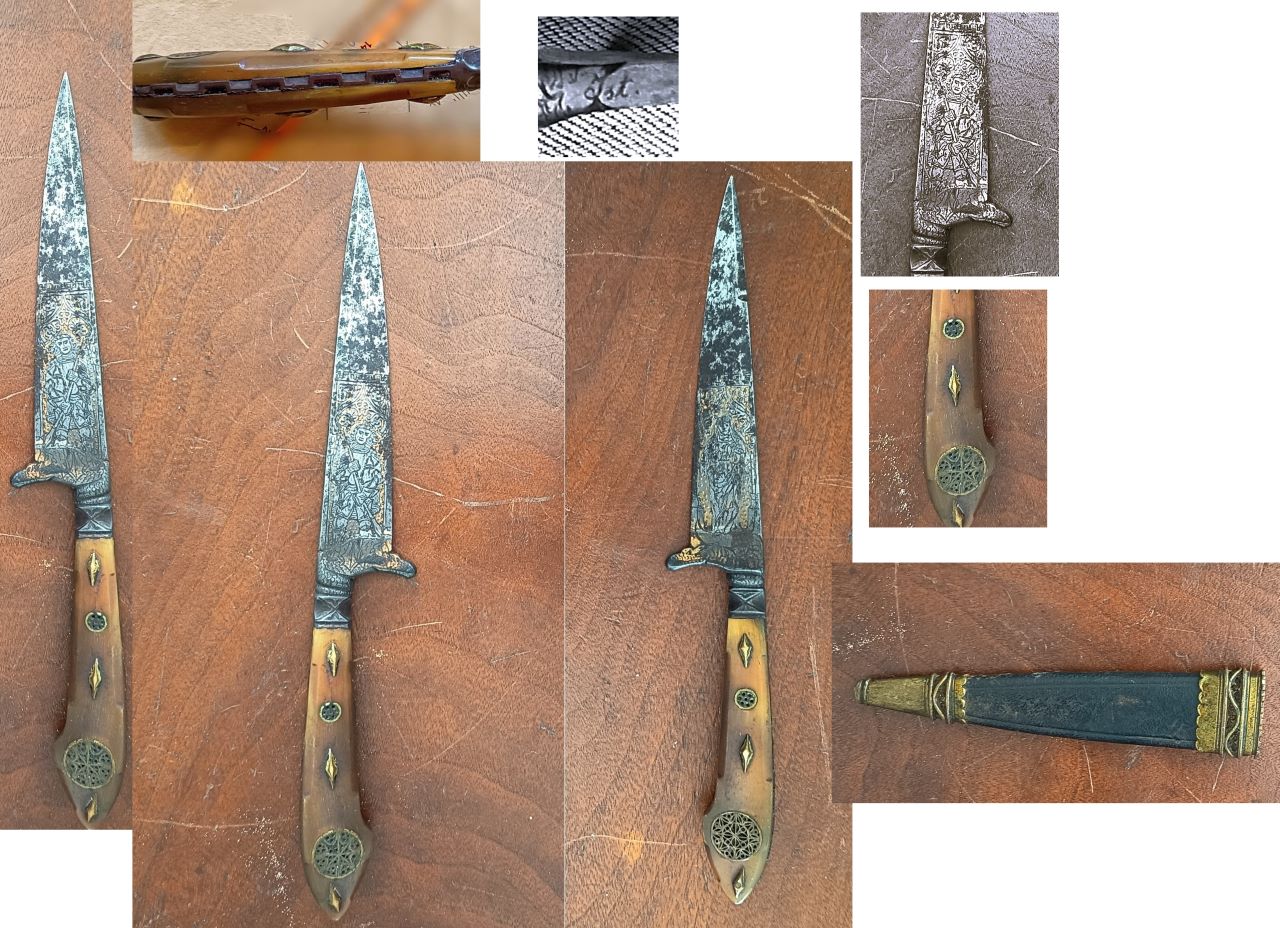 There are a few issues. The mark or signature Jst. remains unidentified. Another is that after looking at thousands of images of knives and swords on the internet, I have yet to find others with the geometric elements of brass on the handle, or the composition and design of the handle, the figures on the blade, the shape of the blade, or a similar sheath.