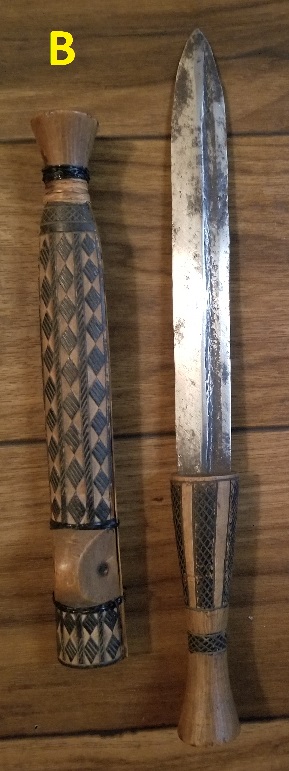 Blade B vaguely resembles a Rwandan Tutsi sword in my collection, particularly the decoration on the scabbard and hilt, but I'm also not confident in this ID