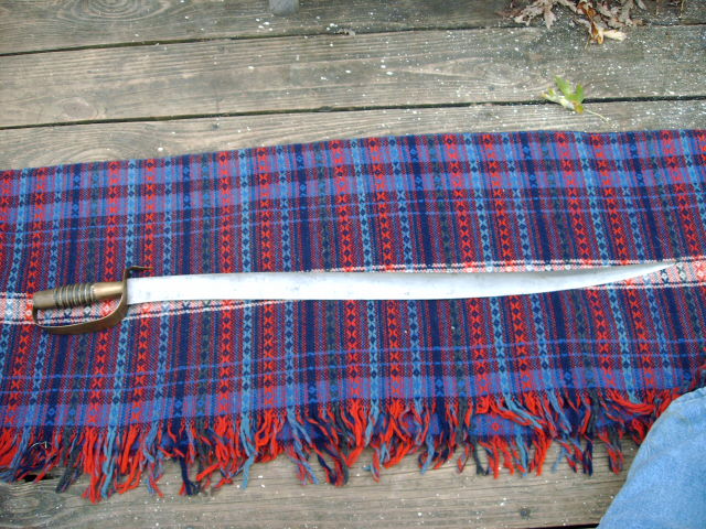 Nice heavy D-Guard sword with horn handle and brass fittings and guard, sharpened false edge. I have been told that there is one exactly like it at the War Memorial Veterans Museum in San Francisco, donated by someone by the name of Funston, who was an Officer in the Spanish American wars.