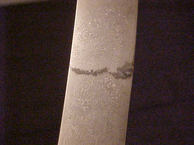 FYI: I had an unfortunate accident where the wootz blade was dropped and broken in half. I have a friend in Damascus, Syria who has a small shop. He is specializing in refitting shamshirs and re-creating silver scabbards, crossguards, hilts, etc. He was able to weld the blade together in a perfect fashion, so one has to look very closely to be able to see the connection line. The blade was wootz, and no pattern distortions were visible after the blade was re-etched. There are also several others in Damascus who can do the same type of work, and who routinely weld broken blades together, however not as well.