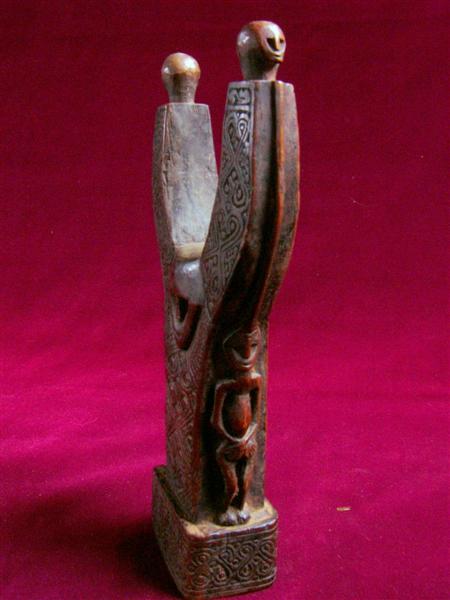 I do not know the age, but it is from an old collection and has wonderful patina. I like the representations of the male (picture #2) and the female (picture #3) on the sides of the handle. Balance of male and female supporting the piece. Symbolism depicting male and female was very important to the animistic / pagan societies. This went far deeper than mere fertility. Tantra also means overcoming obstacles. The fascinating lines on the piece are a common motif in Timor, and also the Dayak and Batak peoples. Look like whorls of energy to me. I wonder what they see? Early, pre-contact pieces from animistic tribes, whether African, Indian, Indonesian or other cultures, were made for a purpose that was not considered merely art by the people who made them. The symbols were there to make the pieces more effective tools, weapons, communications devices with spirits -- even gods. Not decorations. It is likely that the carver thought that the intricate carving made this piece a more powerful weapon. He certainly spent a lot of time and effort on it. 8 inches (20.32 cm) Tall |