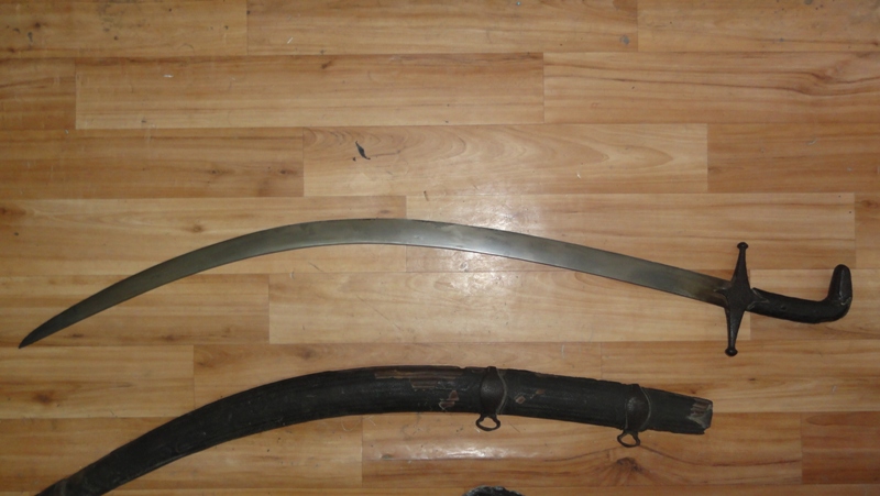A very nice sword, heavy blade made of folded steel, not wootz. the hilt is leather wraped wood, unfortunately the wood is broken at 2 places, 1 where it curves by the pommel area and 2nd by the hand gaurd. There is serious oxidation on the area that were not covered by the scabard. However the oxidation has stoped. There are no marks on the blade, just a nice straight and uniform blade.