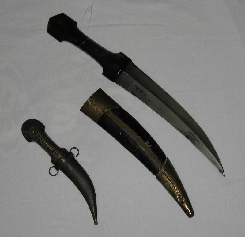The big one is from Yemen but the small seems to be more Georgian due to the general shape of the hilt and especially the scabbard with the wire binding which is never seen on Yemen scabbards. Below is a small Yemen jambiya for comparison. Congrats Lew |