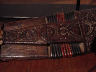 A EXAMPLE LIKE THE ONE PICTURED WHILE MADE FOR CEREMONIAL USE OR PRESENTATION HAS A SERVICIBLE BLADE, GOOD CARVEING AND WORKMANSHIP THRU OUT. THEY WERE NOT MADE FOR HEADHUNTING AND DON'T USUALLY DATE TO THAT PERIOD SO WILL NOT APPEAL TO ONE WHO IS ONLY INTERESTED IN THAT PERIOD AND ASPECT BUT ARE A GOOD EXAMPLE OF DAYAK WORKMANSHIP AND ART. MOST OF THE SWORDS SEEN IN THE SHOPS IN KUCHING ARE OF MUCH POORER QUALITY AND ARE FAIRLY RECENT ( SAY WITHIN THE LAST 60 YEARS) BUT THERE ARE SOME STILL BEING MADE THAT HAVE SUPERB WORKMANSHIP AND DON'T LOOK TOURISTY OR NEW BUT THEY ARE FEW AND FAR IN BETWEEN. A COLLECTOR MUST BE VERY KNOWLEGABLE, LUCKY AND HAVE VERY DEEP POCKETS TO COLLECT THE GOOD OLD DAYAK WEAPONS THESE DAYS. I DON'T QUALIFY IN ANY OF THE THREE CATAGORIES SO I MUST BE CONTENT TO LOOK AT THE PICTURES AND THE FEW EXAMPLES I GOT IN THE PAST AND LEARN WHAT I CAN ABOUT THEM.