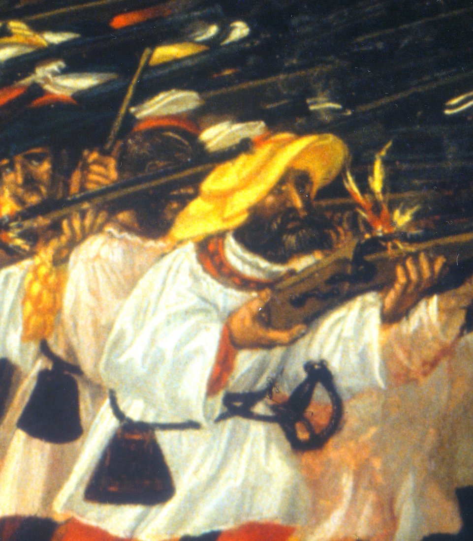 Actually, these instances of period artwork prove that they were in use from at least ca. 1530; I cannot remember any illustrative source picturing a trapezoidal flask after ca. 1600. We may therefore assume that both their manufacture and employment had generally stopped by the early 17th c. As bandoliers equipped with ready-to-use powder measures are known to have been in use from at least ca. 1500 until the second half of the 17th c., it seems probable that, in a group of arquebusiers/musketeers, only very few members actually carried an additional large powder flask to provide bandolier refills when needed. As these samples illustrate, the wooden body of the earliest of these flasks was sometimes covered with interwoven, even maybe embroidered, textiles to match the stock of the accompanying arquebuses which was decorated en suite. Two of these matchlock arquebuses with velvet-covered stocks, of ca. 1540, are preserved in the Hofburg Museum in Vienna (traditionally just called the 'Wiener Waffensammlung'). The largest number of surviving examples with textile-covered body is preserved in the Graz armory; close examinations proved that their textiles actually were reused Gothic chasubles! Please note that 16th c. triangular flasks are often depicted to be carried on the back by the arquebusier/musketeer! Attachments, from top: - 1529, from a painting by Ruprecht Heller, The Battle of Pavia, which took place in 1525 (2) - 1554, The Battle of Marciano (2) - ca. 1550, Jacob Binck (1) - ca. 1560, Franz Brun (1), very similar to the foregoing - ca. 1565-70, Stradanus, Medici Court painter (2) - ca. 1585, Hendrick Goltzius (2) - ca. 1590, Jacob de Gheyn (1) - two arquebuses with textile-covered stock (the velvet now mostly rubbed, with only the remaining), ca. 1540, Vienna Waffensammlung (1) For more on such flasks, please see http://www.vikingsword.com/vb/showth...s+powder+flask http://www.vikingsword.com/vb/showth...s+powder+flask Best, Michael Last edited by Matchlock; 19th June 2012 at 01:02 AM. |