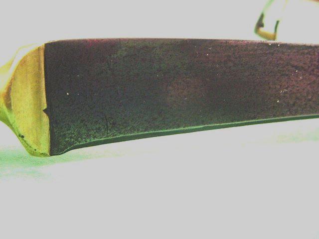 This knife looked interesting and has peaked my interest after a mild cleaning and a light etch. Is the pattern mechanical? Do you think a thorough polish will be worthwhile? What was it's purpose? Here is a link that indicates probable origin. http://www.vikingsword.com/vb/showth...ht=bird+dagger The blade is 8 inches, handle appears to be horn. The bolster appears to have been cast to the blade?
