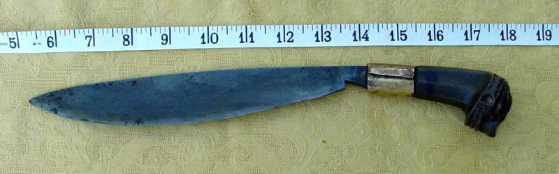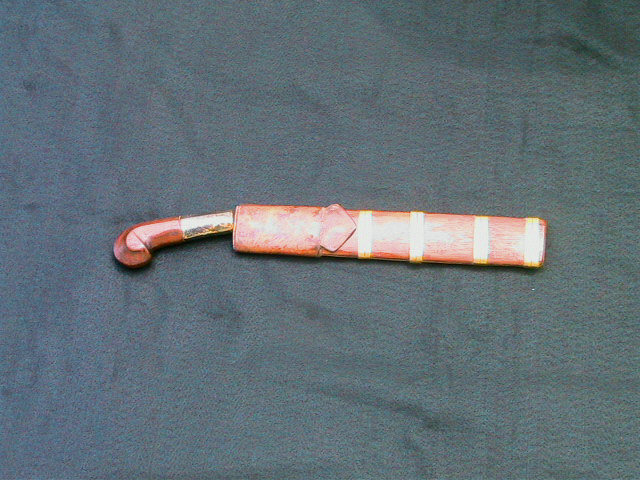 It is uncommon to see this abbreviated kakatua style pommel on a wide-bellied chopper, but I have seen at least one other example of this combination.