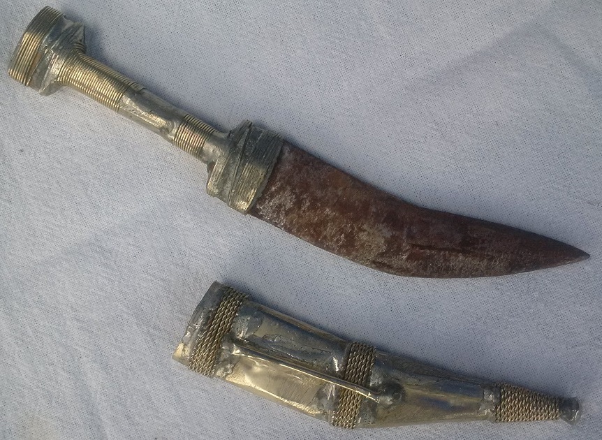 Anything I say is a speculation because I have not seen anything similar before. Still I think that it is a nice and genuine find. Some aspects, like the twisted and wrapped silver wire, the general shape of the scabbard, and the little knob in the middle of the hilt are typical of shibriyas of the best known Jordanian type. Others, like the dog-leg blade and especially the shape of the pommel do not belong to standard shibiya style. Some technical details, like using one metal sheet on both sides are also different from shibriyas (seperate sheet is usually used for the back). So where is it from? The shape of the blade points to an early date - before WWI, but I am not sure in this case (see discussion in http://www.vikingsword.com/vb/showth...ghlight=Motan; http://www.vikingsword.com/vb/showth...highlight=Mota). The shape of the hilt and especially the pommel are reminicent of Iraqi (Bagdad) daggers. Just by gut feeling, I would place this dagger somewhere in Northern Arabia, where daggers called shibriya are much more diverse and include many blade and pommel shapes similar to this one.