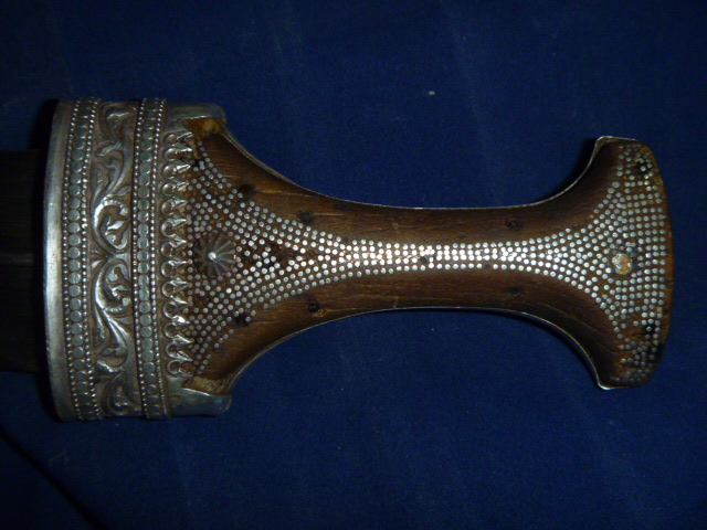 For some, the really only charismatic Omani Dagger with a full pedigree is the Royal Khanjar or sa'idiyyah khanjar noted for its 7 rings(hilqah) and highly ornate and unique hilt.(qarn) and scabbard (ghumb) A further identifying marker is the odd little triangular link attaching from the top of the chape(quba) to the belt (hazam) Hand made in the capital, Muscat, this beautiful dagger was said to have been designed by a previous Sultans wife probably influenced by exotic, ornate Indian style using delicate filigree and repouse' work with varied application of the Mulberry Fruit cluster (from the fruit tree common in Oman) Any Omani man can wear this dagger.