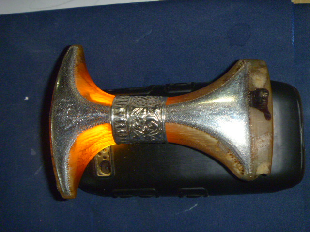 Because the Khanjar is "meccano built'' i.e. from a load of separate replaceable parts it also lends itself to being upgraded easily. A better blade or a horn or Rhino hilt can be fitted..There is technically no end to the upgrade since all the parts are changeable. Many Khanjars get the upgrade treatment at some point. This is normal in Oman.