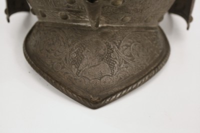 I assume assigning this morion to France is probably correct; the other likely choice would of course be Italy as the style of the etching is clearly based on Italian Renaissance patterns. The bearded male portrait medallion in the second to last image obviously goes back to the later Landsknecht fashion of ca. 1540-50, as known from engravings by e.g. Jost Amman and Virgil Solis. Best, Michael |