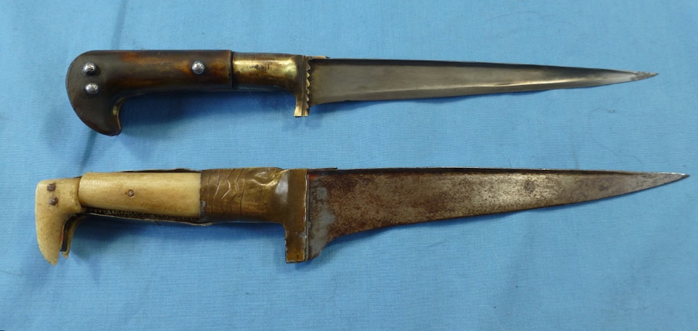 Hello all! We have a real love for the Afghan Choora and thought it would be interesting to have a thread specifically devoted to these often beatufully crafted weapons. It would be interesting to compare the styling and artistic elements encountered and try to pin point definite tribal affiliations. Does anybody know for instance where the pin studded hilts are manufactured? An afghan friend and former member of the Northern Alliance, told us that during his fighting days he saw very few older weapons carried, they being superseded by modern bayonets or bowie type affairs. In fact, our friend was genuinely interested in seeing some of our collected examples and was actually rather lacking in knowledge on such an historic element of his culture. So if you have a favourite old warrior, post a picture and give the spot light to these elegant and often overlooked weapons. We have started the ball rolling with a couple of our old blades, both we think date from the early 20thC.