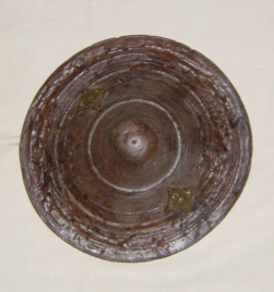 While driving on a delivery run, I think I have figured out how these types of shields are made. They are turned on what is known in the ceramics industry as a Jig and Jolly. This is rather like a potters wheel powered by kicking a large heavy stone or wood flywheel. The piece of semi hard hide, presumably soaked and lubricated, is slapped down on to a basic form, then the jig arm is brought down onto the hide holding in the center hence the indentation. The Jig arm may also hold the Jolly, a profile to shape the hide like the back of a plate or bowl as in ceramics, or may have been Jollied using hand held tools. This type of village industry production could have happened anywhere that wheel made pottery was produced. One reason you do not find this type of shield from much of Africa. Tim